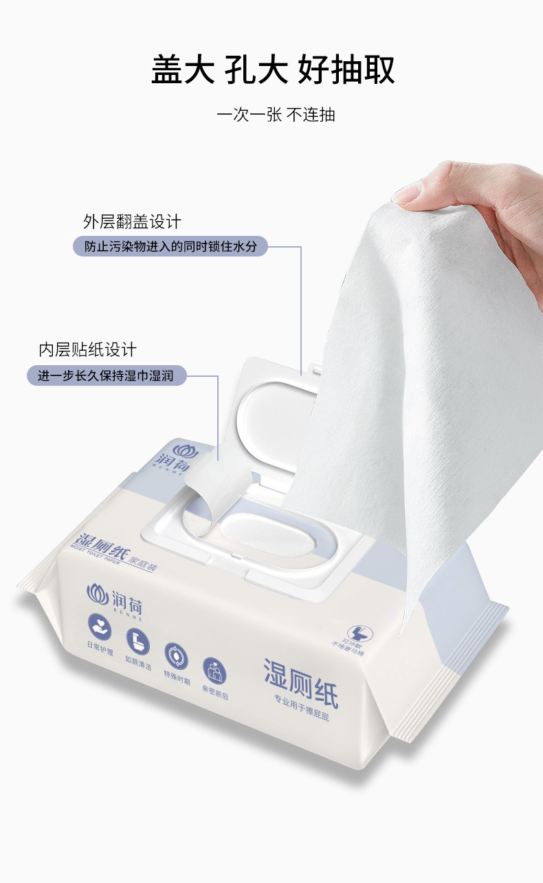 产品说明:打开翻盖,掀起标贴取出湿巾,再将标贴合严,可较长时间保持湿润。