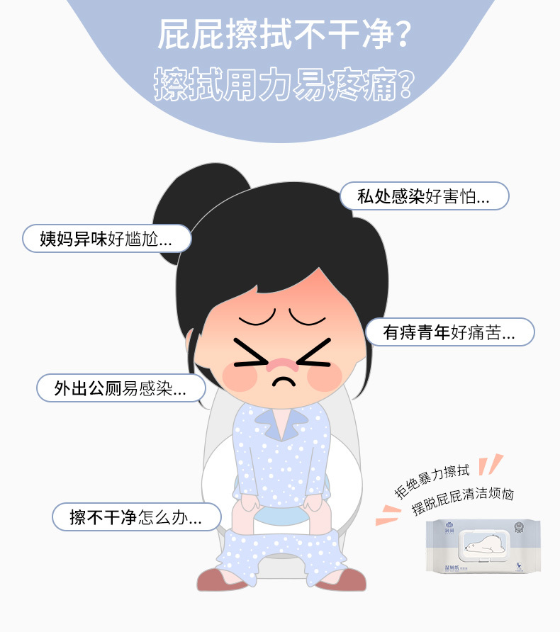 注意事项:仅供外用,避免用于开放性伤口,不可重复使用。本品可冲散,用后可以冲入厕内,但不要一次性丢入过多张,避免堵塞。