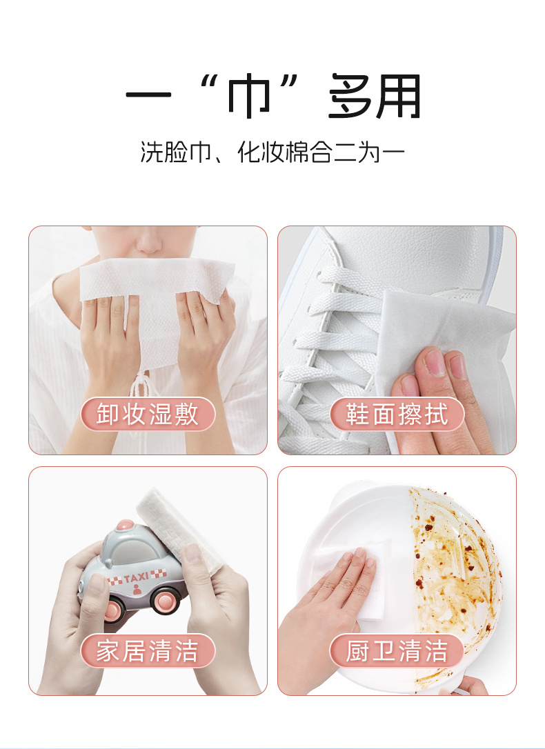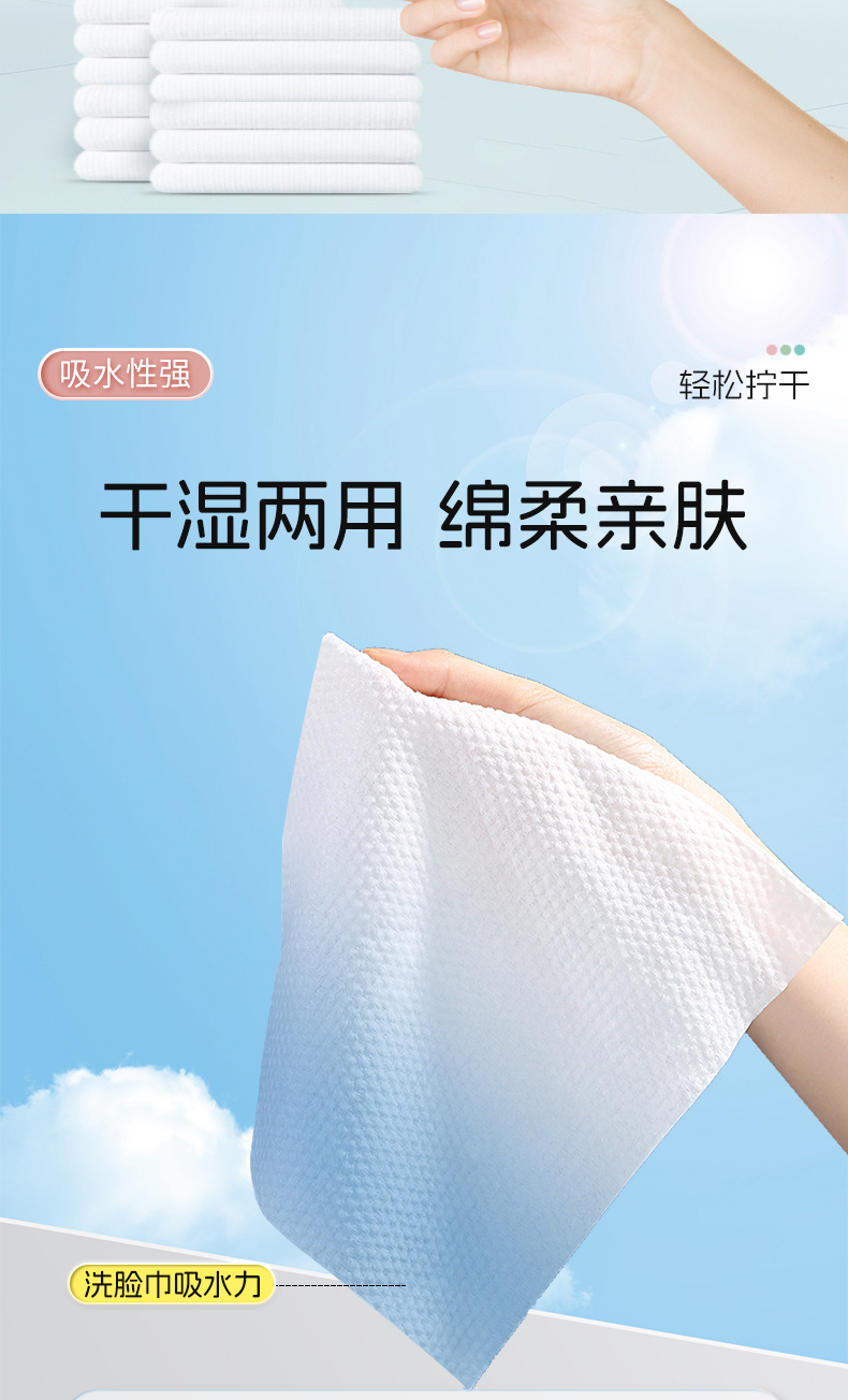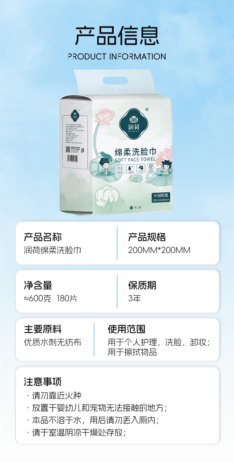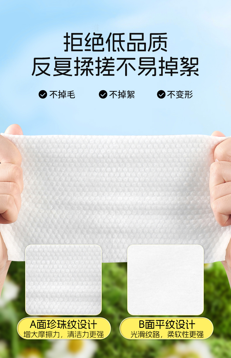 产品特点:优质水刺无纺布,柔韧细腻;不易破不易掉絮;干湿两用,适用多种场景;不含可迁移性荧光增白剂。