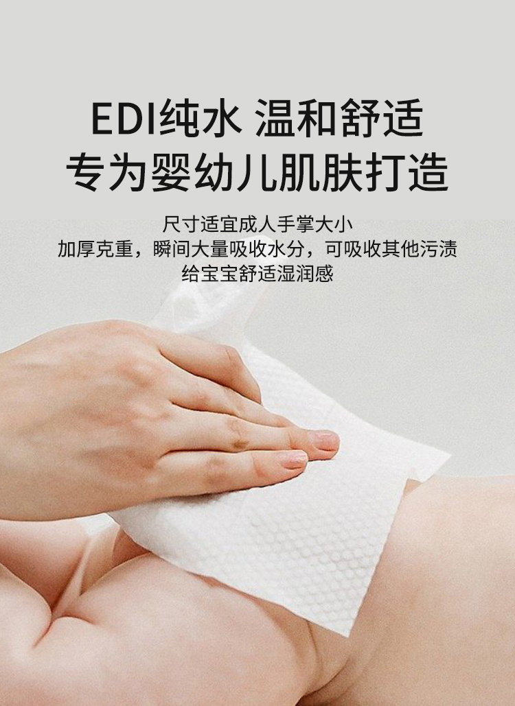 产品特点:九层净化更洁净 打造EDI纯水,干净更安心,柔软湿润,更呵护宝宝娇嫩肌肤,细腻柔软,大包装。